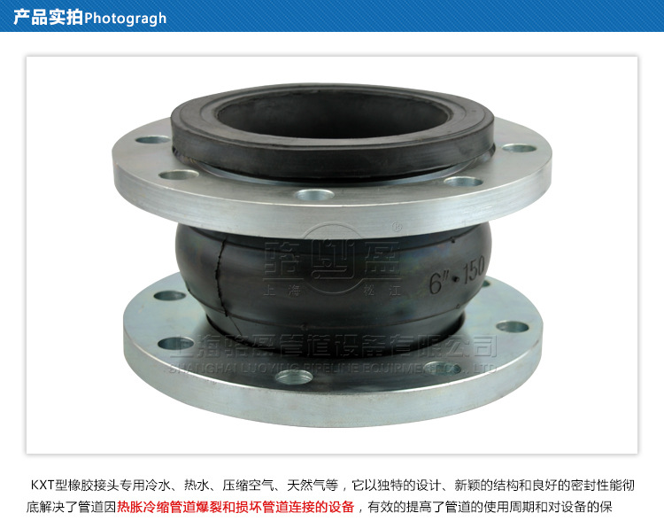 單球體防拉脫橡膠接頭用以金屬材料管路中間起柔性連接功效的空心橡塑制品,由內外層膠、布簾層和鋼絲圈構成管形橡膠產品,經硫化橡膠成形后再與金屬材料法蘭盤或平行面連接頭活套法蘭組成。此商品能夠 和閥門連接,關鍵具有補償管路收攏,降低管路振動對別的機器設備導致的損害,多用以水泵房及振動強烈的管路上。高層住宅給排水應用DN100之上商品,有固定不動固定支架或安裝防拉脫設備。