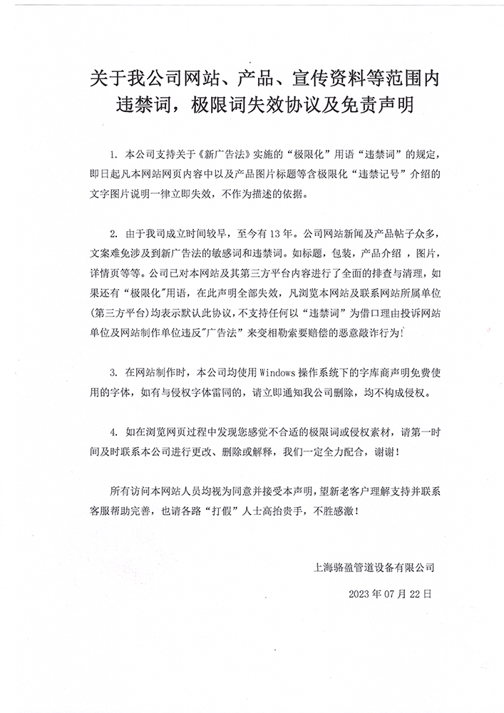 關于我公司網站、產品、宣傳資料等范圍內違禁詞,極限詞失效協議及免責聲明