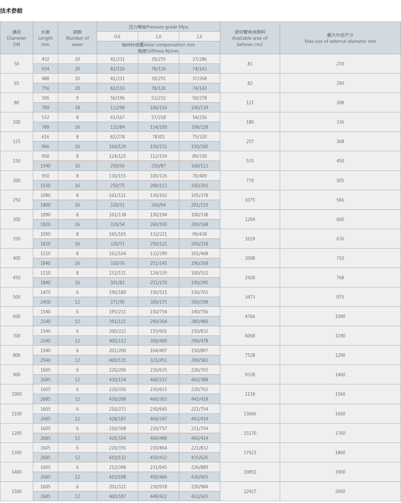 | 通徑 Diameter DN | 長度 Length mm | 波數 Number of wave | 壓力等級Pressure grade Mpa | 波紋管有效面積 Available arae of bellows cm2 | 很大外徑尺寸 Max size of external diameter mm | ||