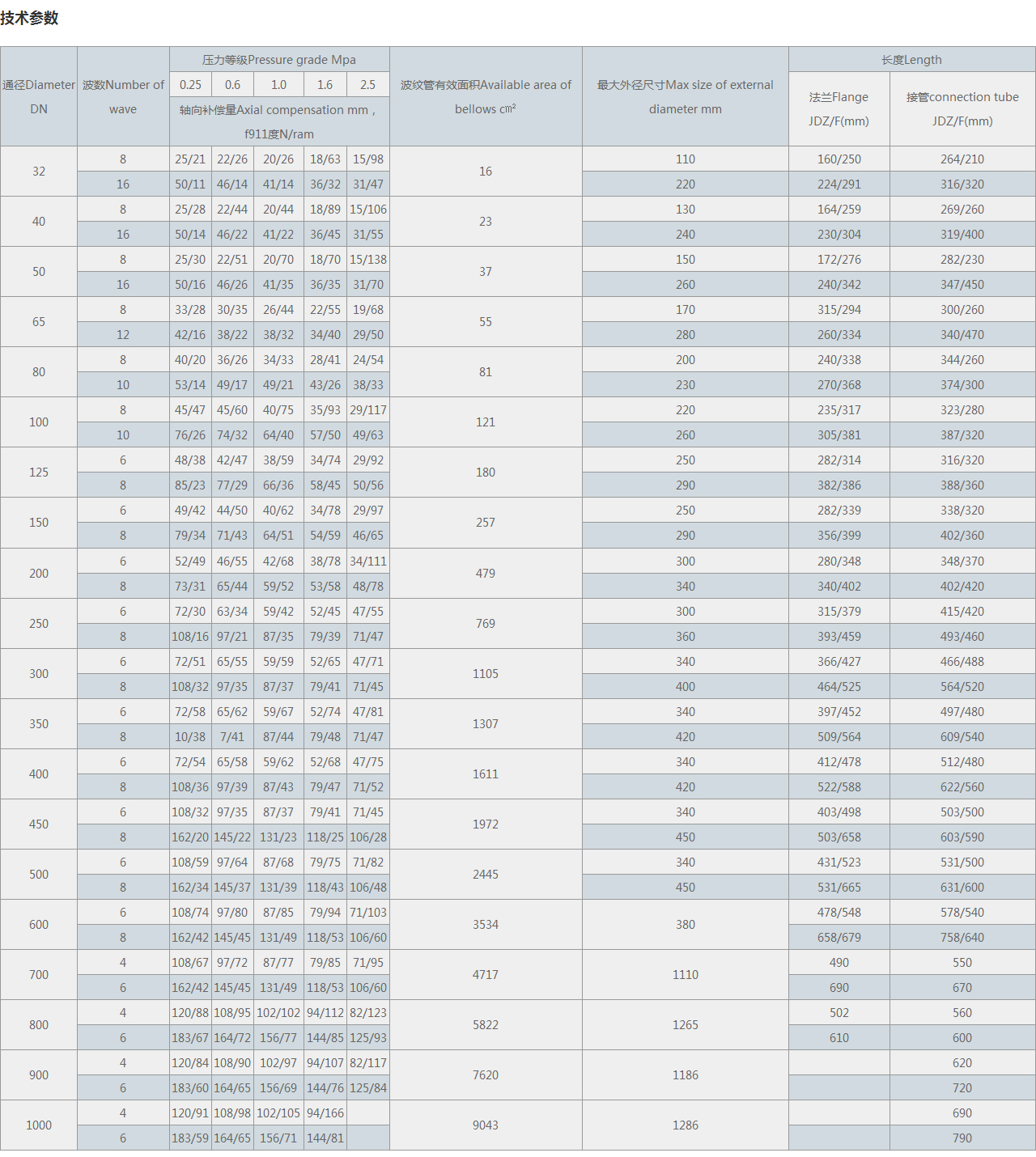 | 通徑Diameter DN | 波數Number of wave | 壓力等級Pressure grade Mpa | 波紋管有效面積Available area of bellows c㎡ | 很大外徑尺寸Max size of external diameter mm | 長度Length | |||||