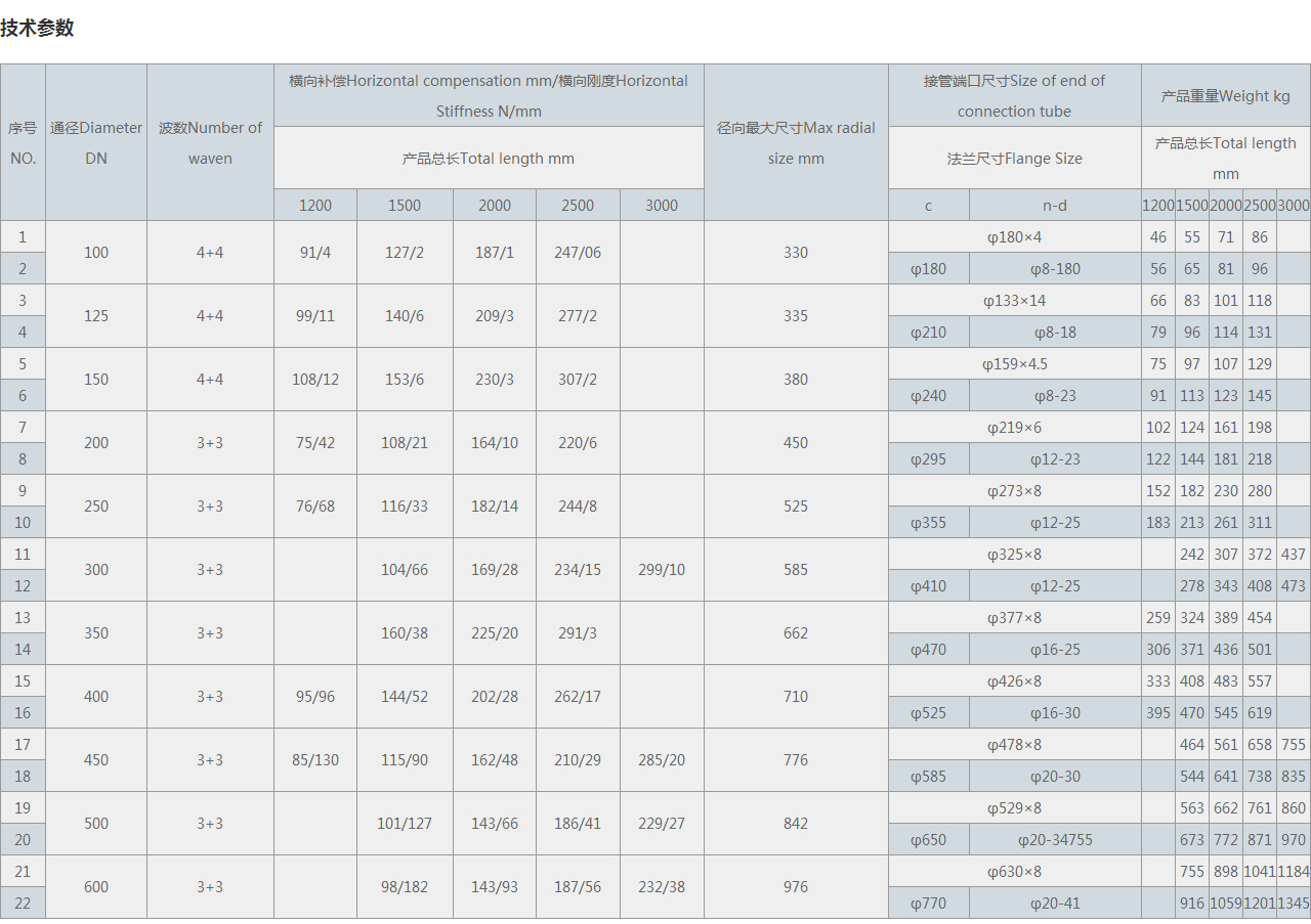 | 序號NO. | 通徑Diameter DN | 波數Number of waven | 橫向補償Horizontal compensation mm/橫向剛度Horizontal Stiffness N/mm | 徑向很大尺寸Max radial size mm | 接管端口尺寸Size of end of connection tube | 產品重量Weight kg | |||||||||