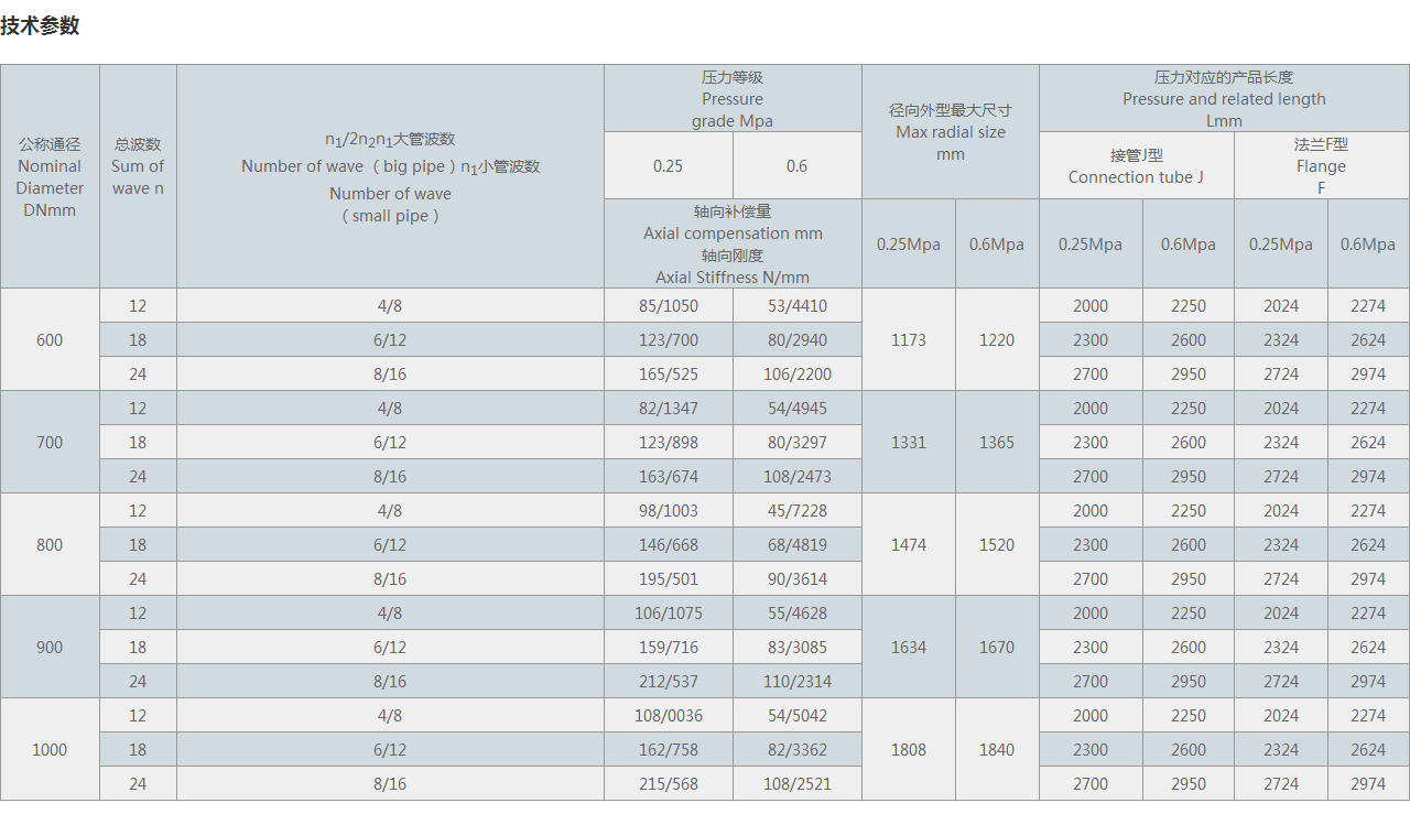 | n1/2n2n1大管波數 Number of wave (big pipe)n1小管波數 Number of wave (small pipe) | 壓力等級 Pressure grade Mpa | 徑向外型很大尺寸 Max radial size mm | 壓力對應的產品長度 Pressure and related length Lmm | |||||