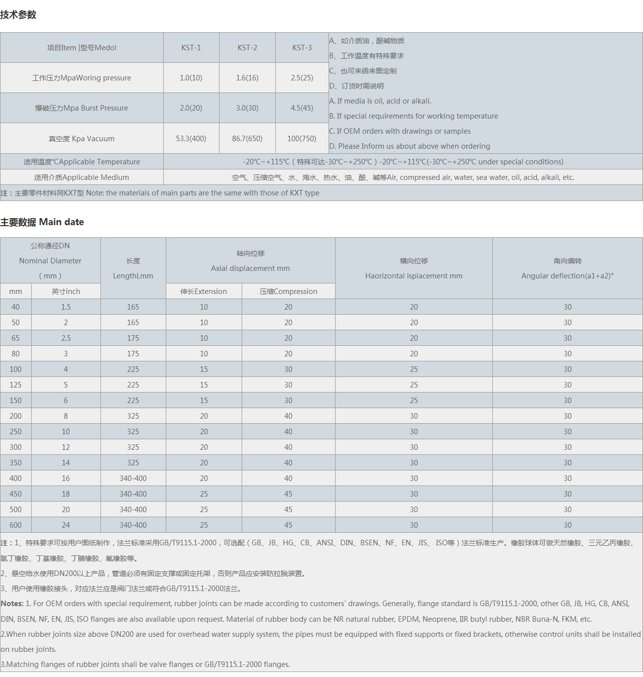 | 注:1、特殊要求可按用戶圖紙制作,可選配(GB、JB、HG、CB、ANSI、DIN、BSEN、NF、EN、JIS、 等)法蘭標準生產。橡膠球體可做天然橡膠、三元乙丙橡膠、氯丁橡膠、丁基橡膠、丁腈橡膠、氟橡膠等。 2、懸空給水使用DN200以上產品,管道必須有固定支撐或固定托架,否則產品應安裝防拉脫裝置。 3、用戶使用橡膠接頭,對應法蘭應是閥門法蘭。 Notes: 1. For OEM orders with special requirement, rubber joints can be made according to customers' drawings. Generally, flange standard is , other GB, JB, HG, CB, ANSI, DIN, BSEN, NF, EN, JIS, flanges are also available upon request. Material of rubber body can be NR natural rubber, EPDM, Neoprene, IIR butyl rubber, NBR Buna-N, FKM, etc. 2.When rubber joints size above DN200 are used for overhead water supply system, the pipes must be equipped with fixed supports or fixed brackets, otherwise control units shall be installed on rubber joints. 3.Matching flanges of rubber joints shall be valve flanges or flanges. | ||||||