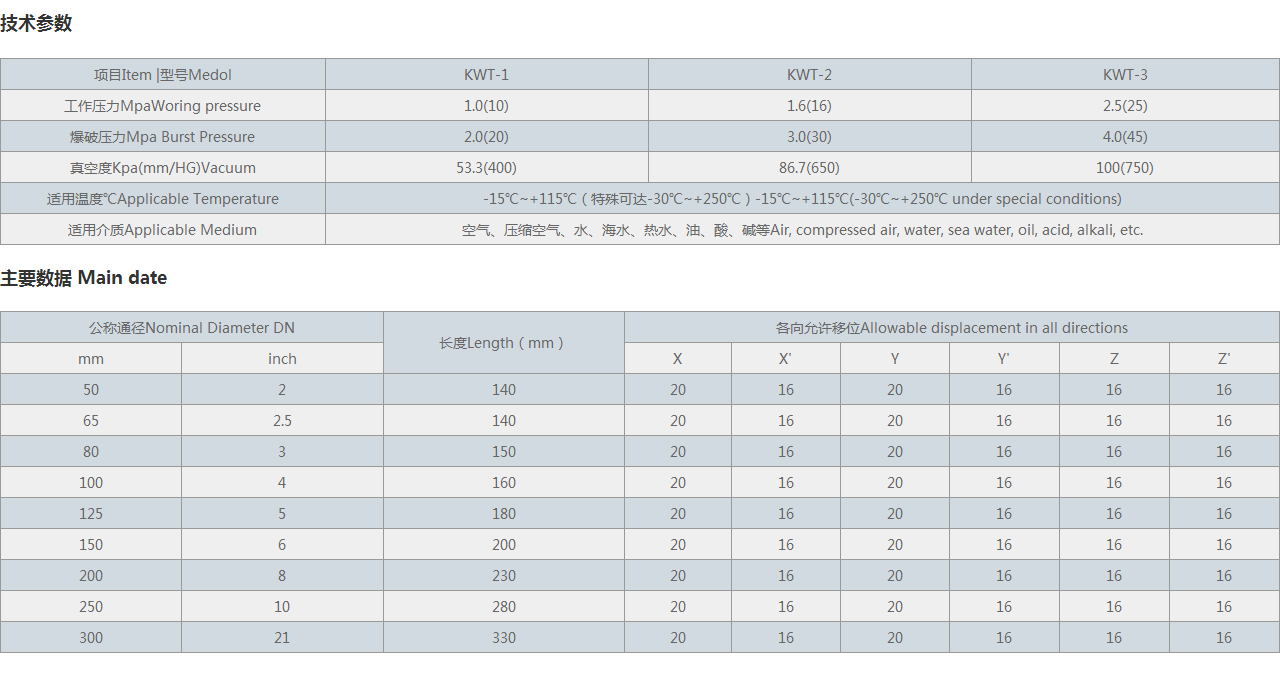 7.可曲繞橡膠接頭正常適用介質是溫度0-60°C的普通水,特殊介質如:油、酸堿、高溫及其他腐蝕性和質地堅硬的情況下,應選用相對應得特殊材料的橡膠接頭,不可盲目串用或通用。