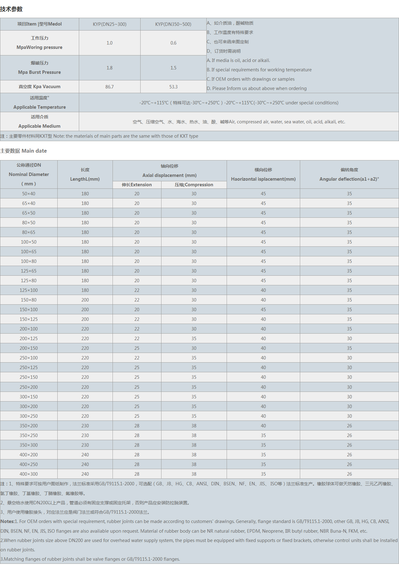 | 注:1、特殊要求可按用戶圖紙制作,可選配(GB、JB、HG、CB、ANSI、DIN、BSEN、NF、EN、JIS、 等)法蘭標準生產(chǎn)。橡膠球體可做天然橡膠、三元乙丙橡膠、氯丁橡膠、丁基橡膠、丁腈橡膠、氟橡膠等。 2、懸空給水使用DN200以上產(chǎn)品,管道必須有固定支撐或固定托架,否則產(chǎn)品應安裝防拉脫裝置。 3、用戶使用橡膠接頭,對應法蘭應是閥門法蘭。 Notes:1. For OEM orders with special requirement, rubber joints can be made according to customers' drawings. Generally, flange standard is , other GB, JB, HG, CB, ANSI, DIN, BSEN, NF, EN, JIS, flanges are also available upon request. Material of rubber body can be NR natural rubber, EPDM, Neoprene, IIR butyl rubber, NBR Buna-N, FKM, etc. 2.When rubber joints size above DN200 are used for overhead water supply system, the pipes must be equipped with fixed supports or fixed brackets, otherwise control units shall be installed on rubber joints. 3.Matching flanges of rubber joints shall be valve flanges or flanges. | |||||