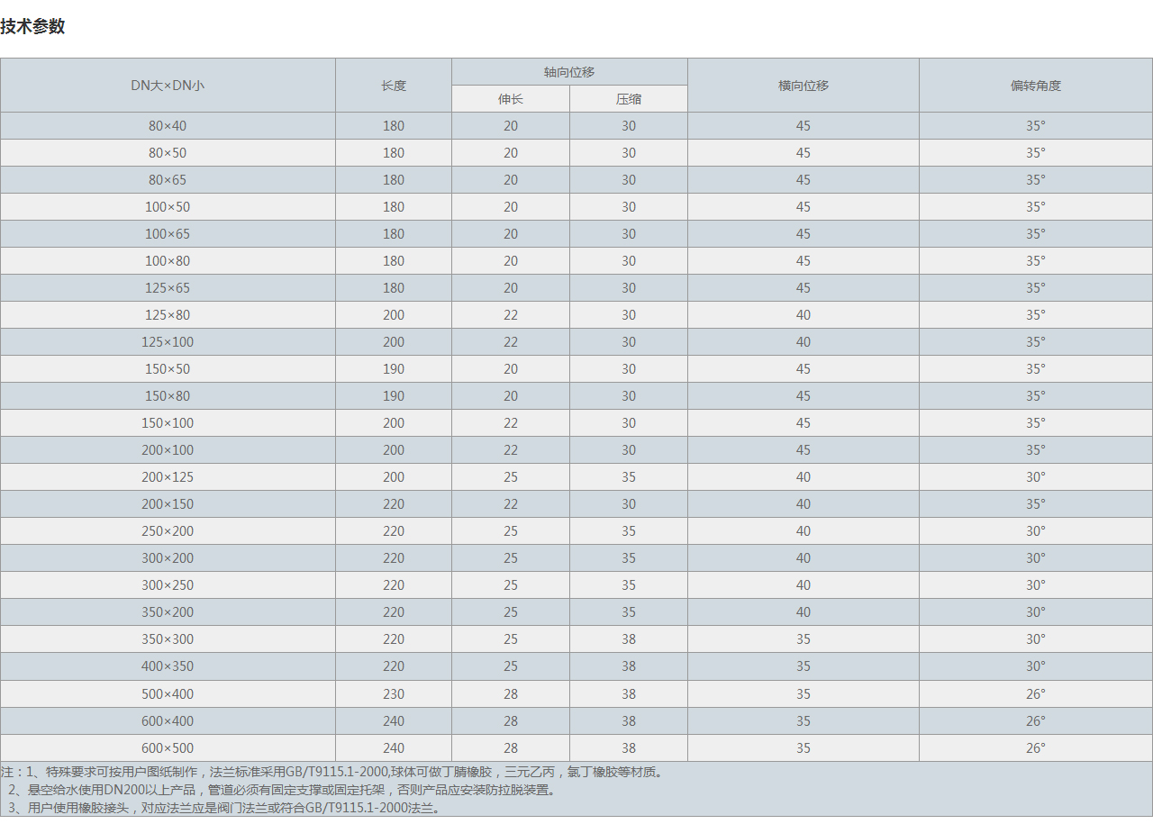 | DN大×DN小 | 長(zhǎng)度 | 軸向位移 | 橫向位移 | 偏轉(zhuǎn)角度 | |